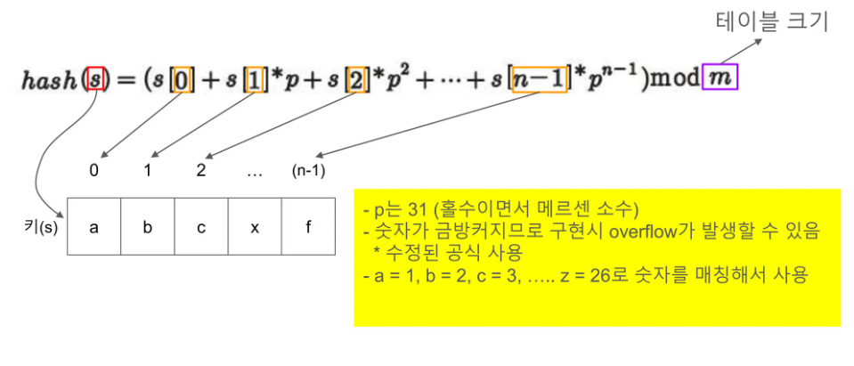 hash(s) = (s[0]) + s[1] * p + s[2] *p2+ ... + s[n-1 *p n-1) mod m