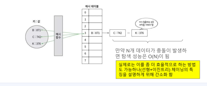 특정 버킷에 데이터가 N개인 경우, 원하는 값을 찾는데 O(N)이 걸릴수 있음