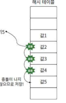 충돌 발생 시, 해당 버킷에 링크드리스트로 데이터를 연결함.